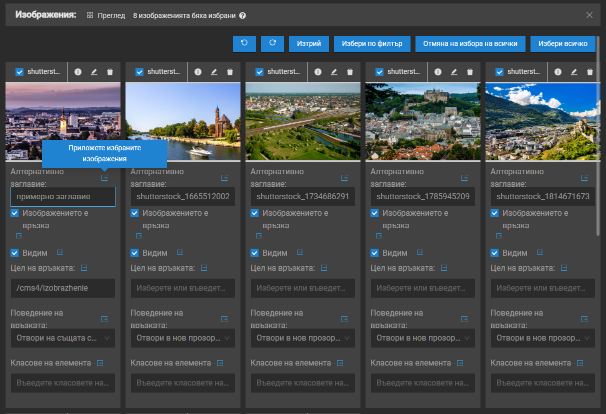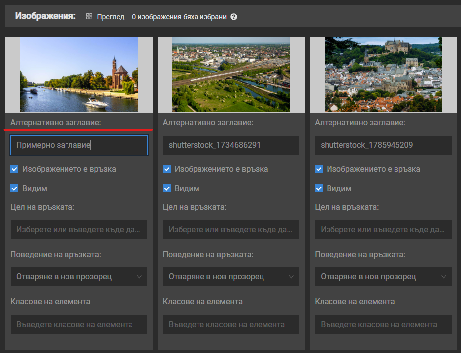 Например ако искаме всички изображения да са с еднакво алтернативно заглавие "примерно заглавие", маркираме ги и след това от синята иконка до "Алтернативно заглавие" на първото изображение поставяме същото заглавие и на останалите.