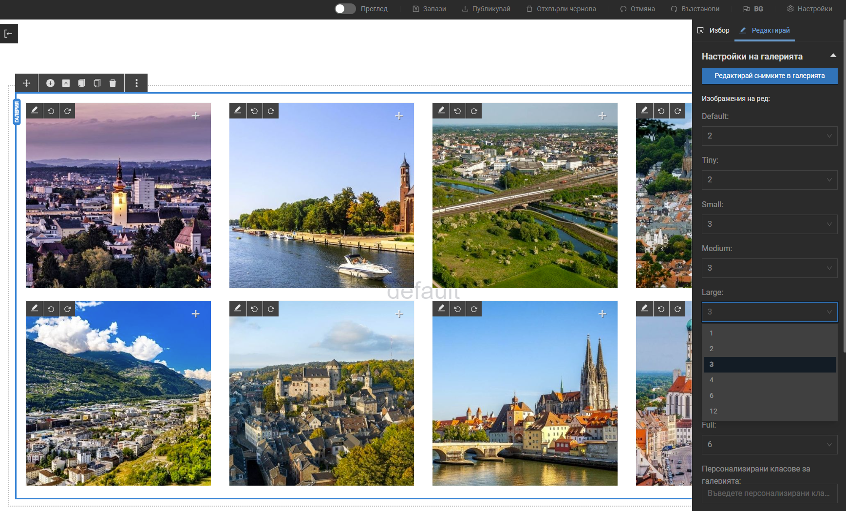 Ето пример, ако изберем на Large (992 px - 1199px) да се показват по три снимки на ред:
