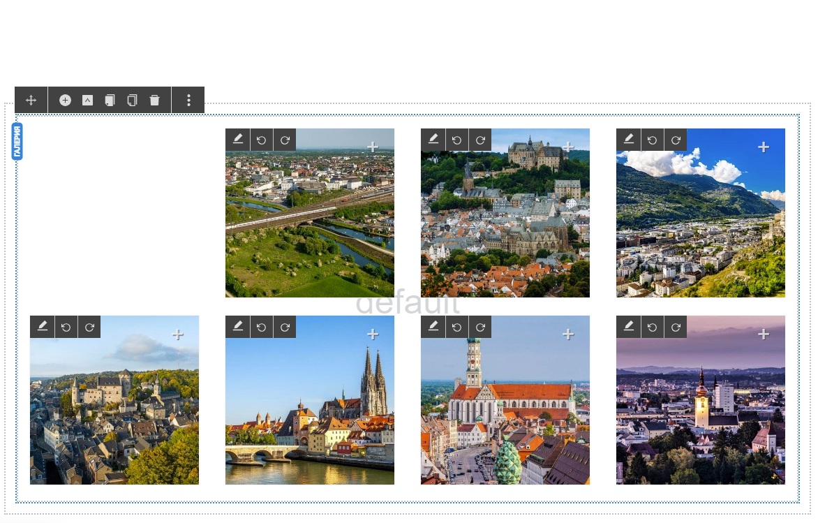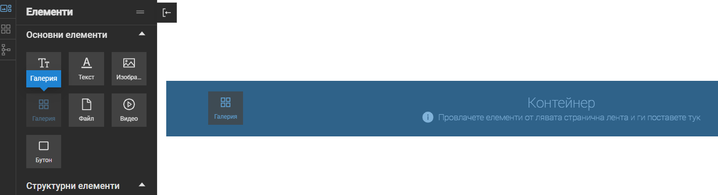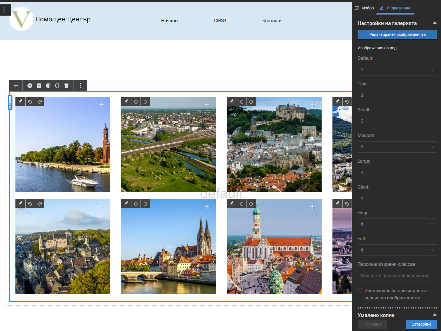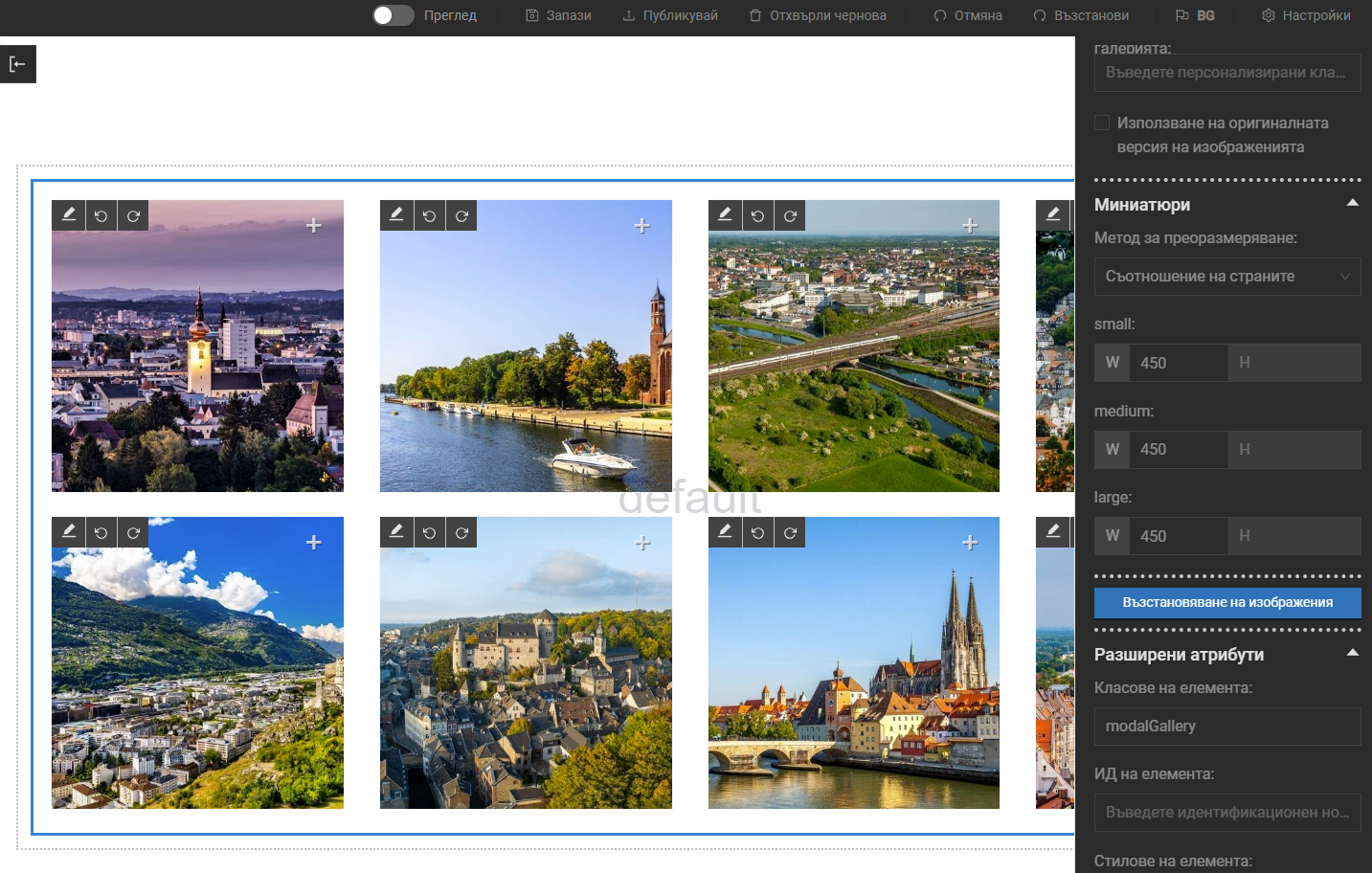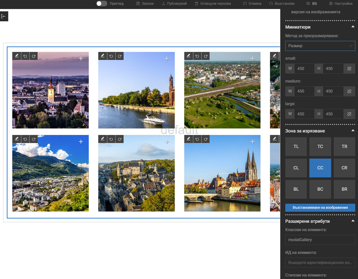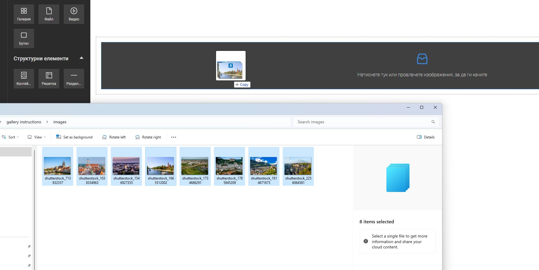 Тук ще използваме пример с добавяне и редактиране на няколко снимки от файлове, които не са качвани преди на сайта. Добавяме ги чрез влачене и пускане в елемента "Галерия".