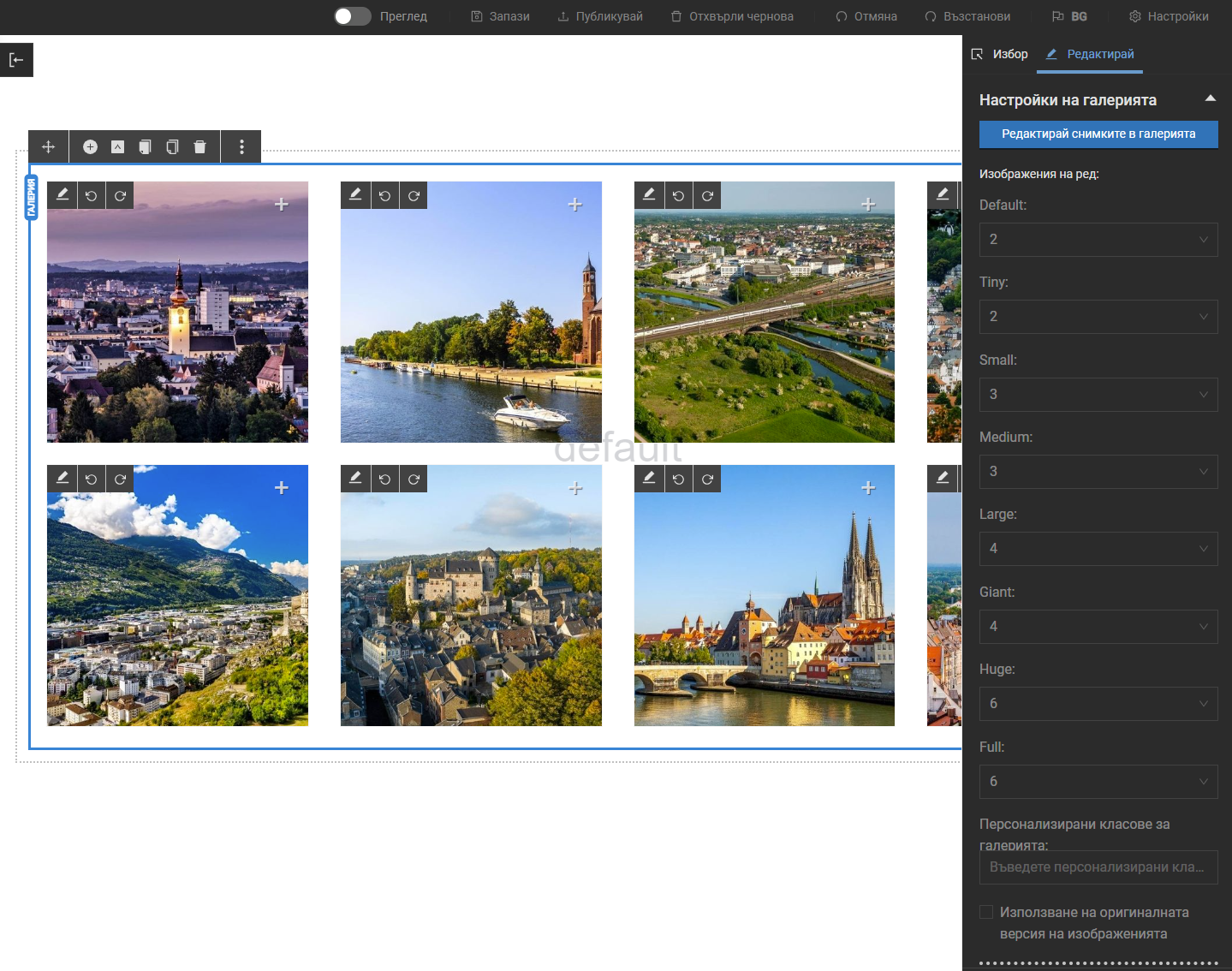 В секцията "Редактирай" са включени и други възможности. Под полетата за избиране на брой изображения на ред има място за поставяне на допълнителни персонализирани класове на галерията и активиране на опцията за запазване на оригиналнта версия на изображенията.