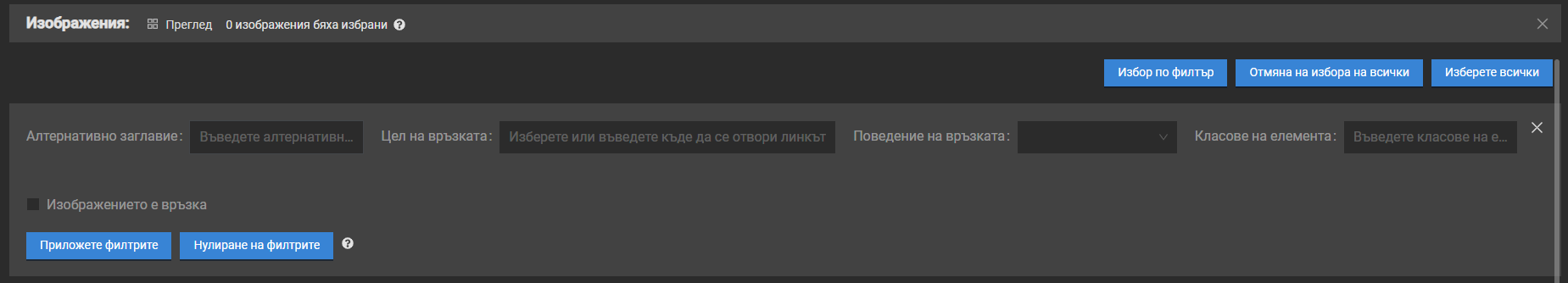 Ако в този панел за редактиране искате да виждате само група от изображения, които отговарят на определен признак, може да използваме фунцкията "Избор по филтър" - по алтернативно заглавие, цел на връзката, поведение на връзката, класове, дали изображението е връзка.