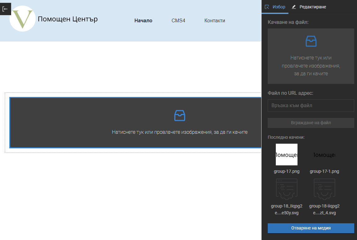 Ако искаме да добавим на тази страница изображение, което сме качвали вече преди другаде на сайта, то ще го намерим в папката "на медията, която достъпваме чрез синия бутон "Отваряне на медия".
