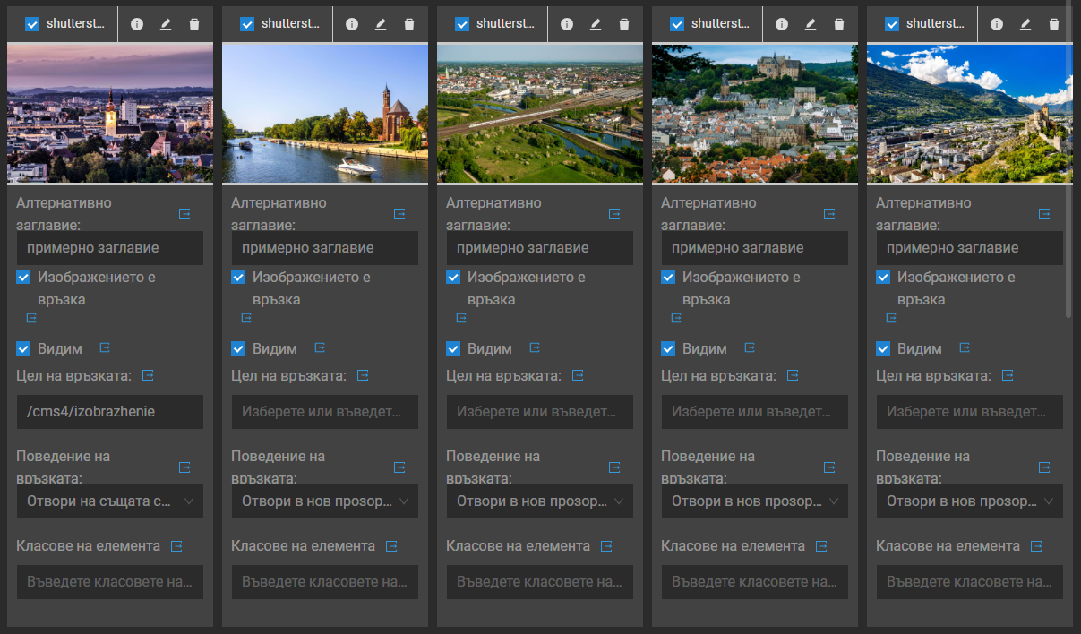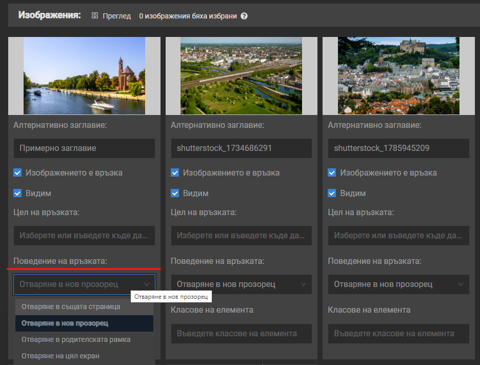 От това меню можем да променяме също алтернативните заглавия на снимките. Освен това, ако имаме отметка на "Изображението е връзка" и сме избрали "Цел на връзката", изображението ще бъде линк и при кликане върху него ще се отваря избраната страница. Можем да посочим друга страница от сайта от падащото меню или външна страница.