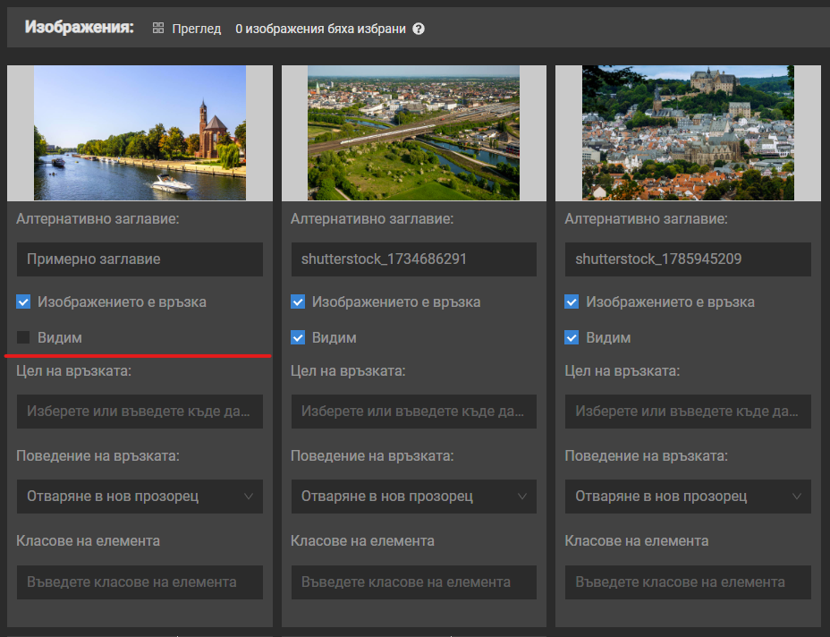 Ако искаме изображението да присъства в галерията, но да не е видимо, махаме отметката на "Видим".