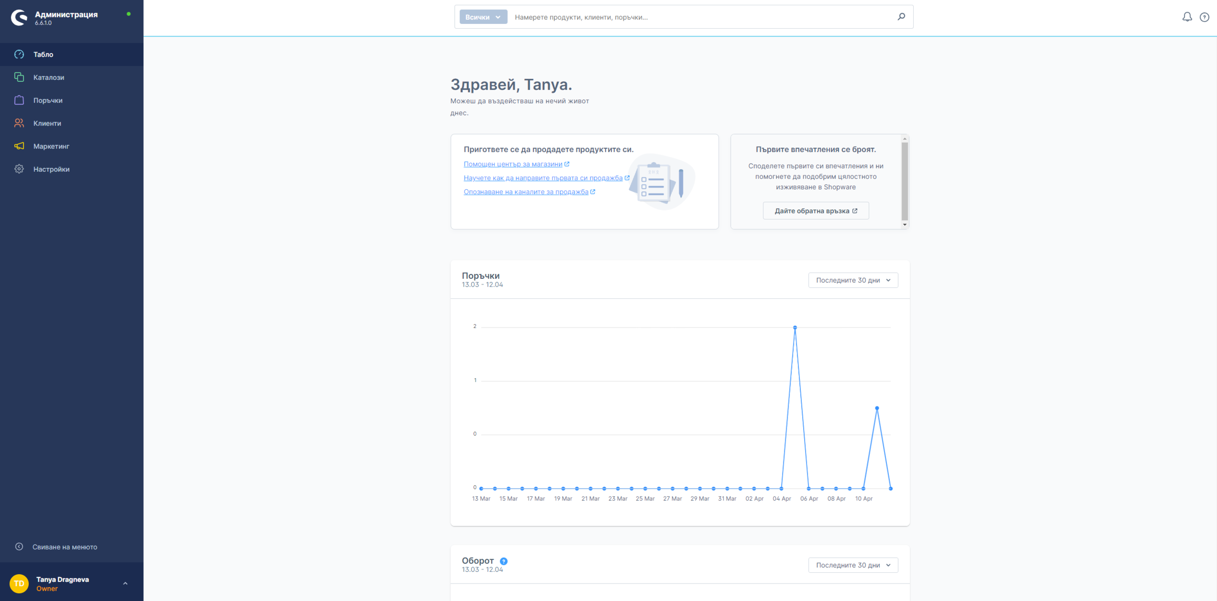 Ако потребителското име и паролата са коректно попълнени, ще ви се визуализира страницата Табло от администрацията на електронния магазин, която съдържа статистики на направените поръчки.