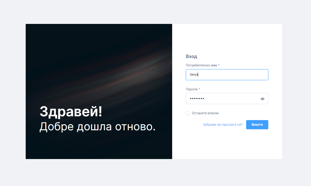Във формата попълнете предоставените от нас потребителско име и парола, а след това натиснете бутона Влезте