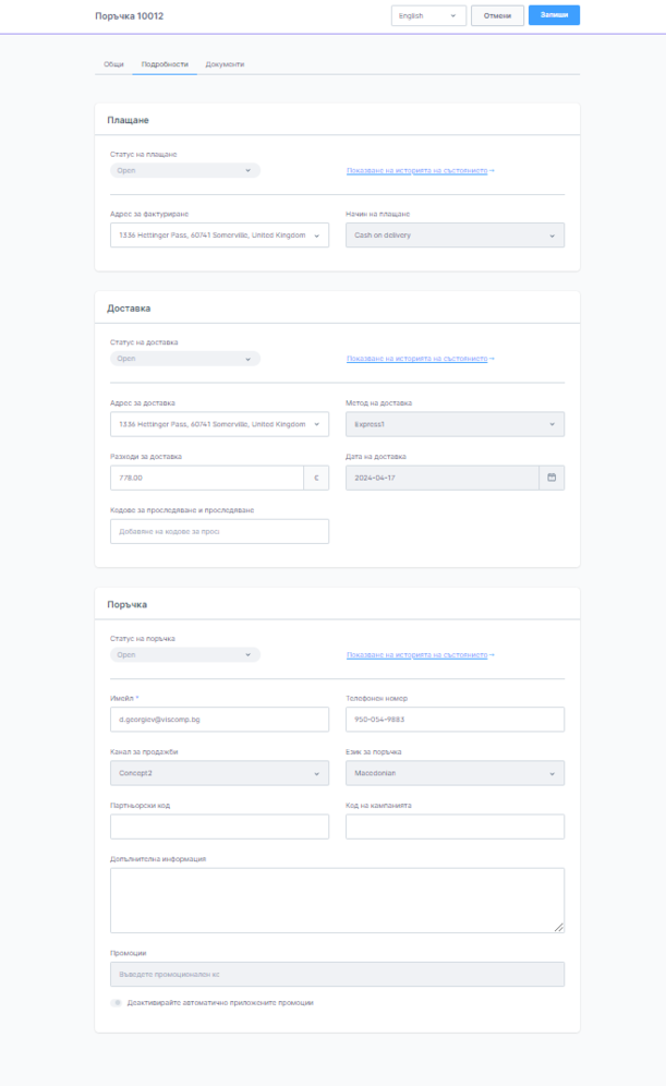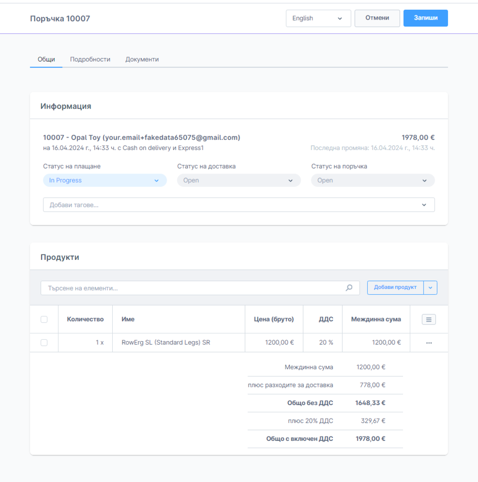 От падащите менюта достъпни в раздел Общи и раздел Подробности може да променяте статуса на поръчката. Може да промените основния статус на поръчката или в детайли статуса за плащане или за доставка