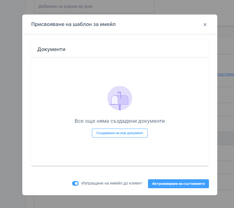 Когато от списъка се избере нов статус, се отваря модален прозорец, в който може да отбележите дали да изпратите e-mail с информация до клиента. Ако отметката е "включена", когато натиснете бутона Актуализиране на състоянието, освен че ще промените статуса на поръчката в администраторския панел на онлайн магазина и клиента ще получи e-mail с информация за смяна на статуса на поръчката.