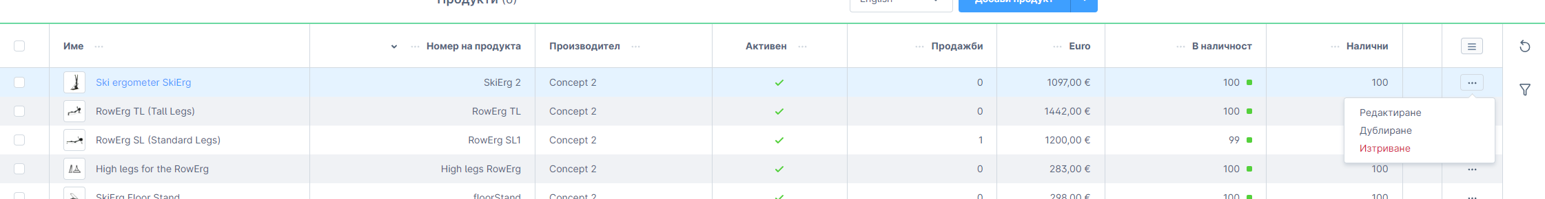 В дясната част на всеки ред с продукт, можете да използвате бутона "..." за да отворите контекстното меню за съответния продукт и да получите достъп до допълнителни функции.