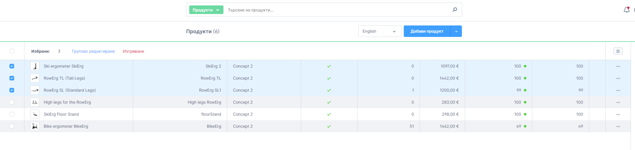Опцията за отмяна на избора на всички продукти се показва само ако сте избрали продукти от множество страници. За да редактирате избраните продукти, кликнете на Групово редактиране, за да изтриете всички избрани продукти, кликнете на Изтриване.