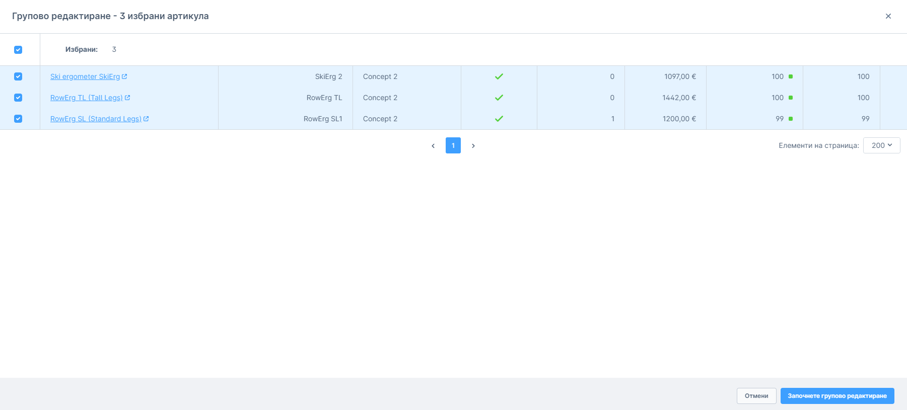 В този изглед имате възможността да премахнете продукти от Вашия текущ списък с избрани. След като сте удовлетворени о Вашия избир, кликнете върху Започни групово редактиране.
